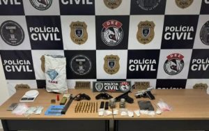 Durante a operação, os policiais apreenderam quatro armas de fogo, uma grande quantidade de munições, além de petrechos utilizados no tráfico e porções de substância análoga à cocaína.