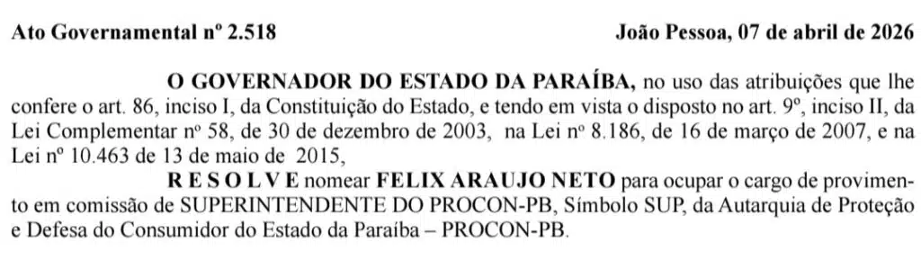 A edição de hoje (08), do Diário Oficial do Estado (DOE-PB), trouxe a nomeação do advogado Félix Araújo Neto pelo governador Lucas Ribeiro como o novo coordenador do Procon estadual.