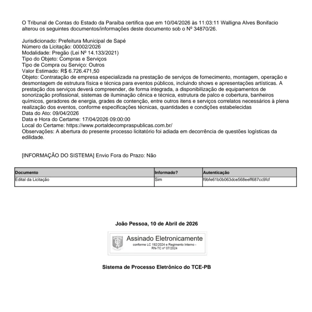 Prefeitura de Sapé divulga edital de licitação para estrutura de eventos com valor estimado em mais de R$ 6,7 milhões