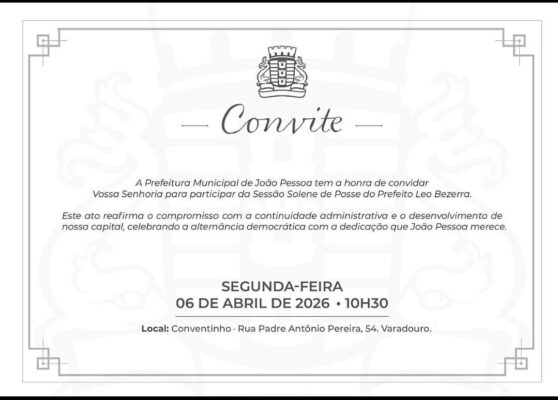 O atual vice-prefeito Leo Bezerra (PSB) toma posse como prefeito de João Pessoa na manhã desta segunda-feira (6). A solenidade está marcada para começar às 10h30, no Conventinho, no bairro do Varadouro.
