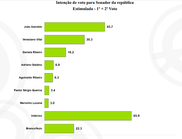 Considerando que o pleito permitirá dois votos por eleitor para o Senado, os percentuais somam até 200%. Com esses índices, Azevêdo e Veneziano seriam eleitos, caso o cenário atual se confirmasse nas urnas.