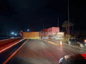 O trecho do Km 74 da BR-101 em Santa Rita, na Região Metropolitana de João Pessoa, ficou interditado após uma carreta tombar na noite dessa terça-feira (23).